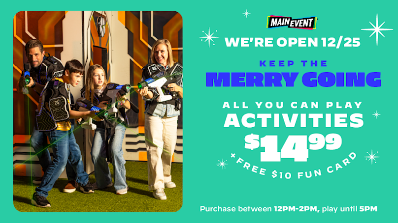 Once presents are done, keep the fun going Christmas afternoon with $14.99 All You Can Play Activities plus a FREE $10 Fun Card! Purchase between noon and 2PM, play until 5, 12/25 only.
