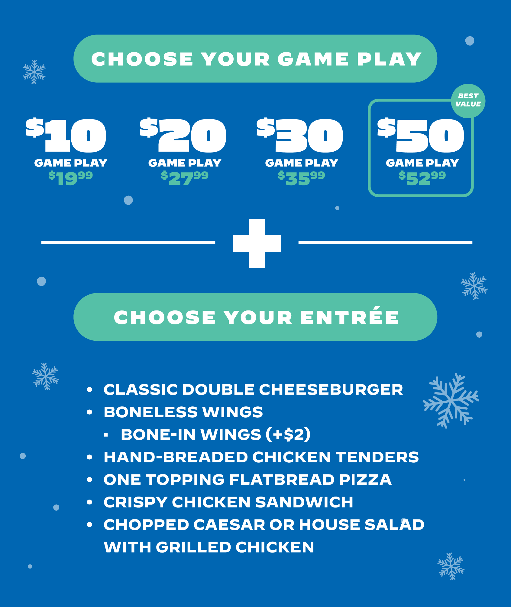 Hack your holiday with the ultimate combo: your choice of game play plus a select entrée, starting at just $19.99.